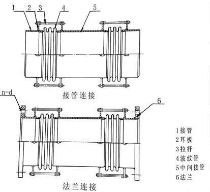 小拉桿橫向波紋補償器(膨脹節(jié),伸縮節(jié))由兩段波紋管、中間接管及帶有限螺母的小拉桿等零件組成,它在吸收管系任意平面內(nèi)的橫向位移,同時吸收軸向位移。小拉桿不能承受內(nèi)壓推力。