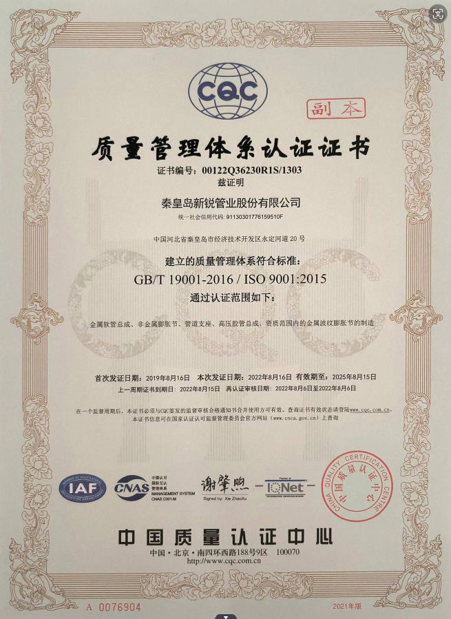 質(zhì)量管理體系認(rèn)證證書(中文)有效期至2025年8月15日